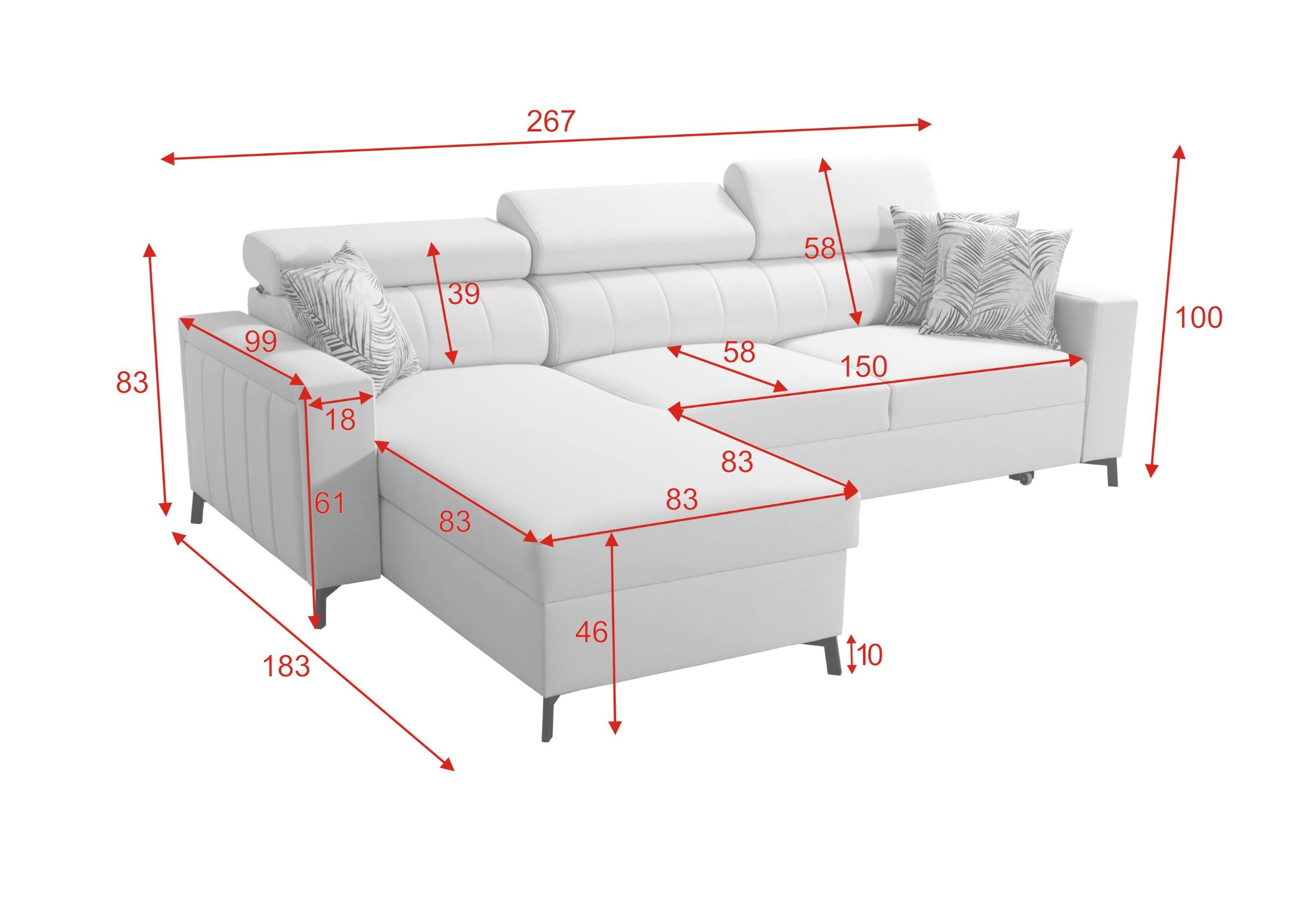 Narożnik został wyposażony w funkcję spania o powierzchni 228cm x 128 cm, dzięki której w szybki i wygodny sposób zmienisz go w dodatkowe miejsce do nocnego odpoczynku. To praktyczne rozwiązanie sprawdzi się podczas wizyt gości lub w mniejszych mieszkaniach.