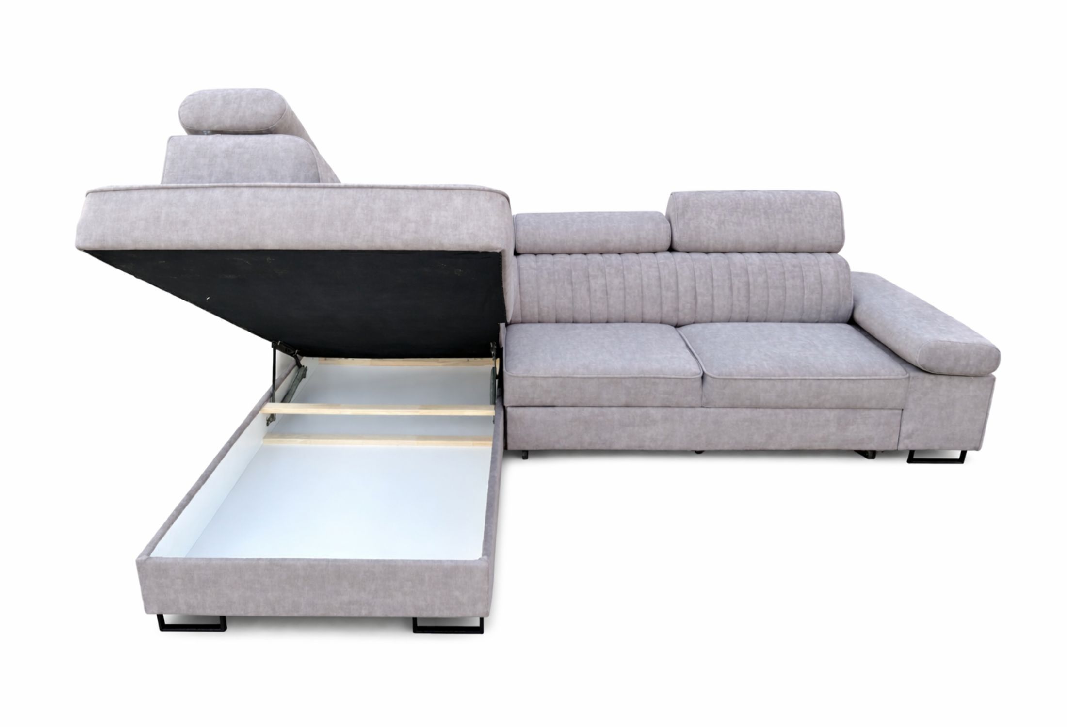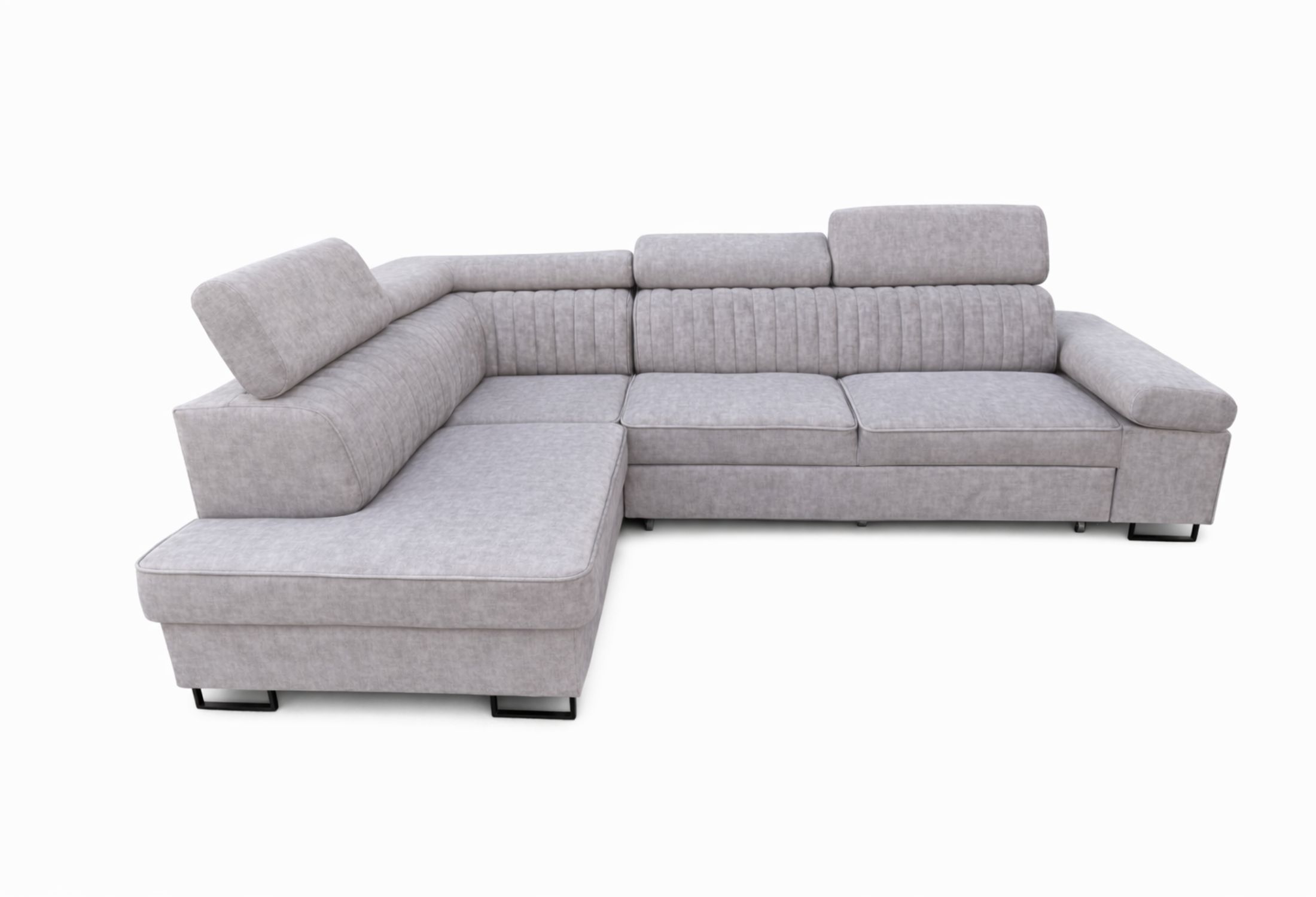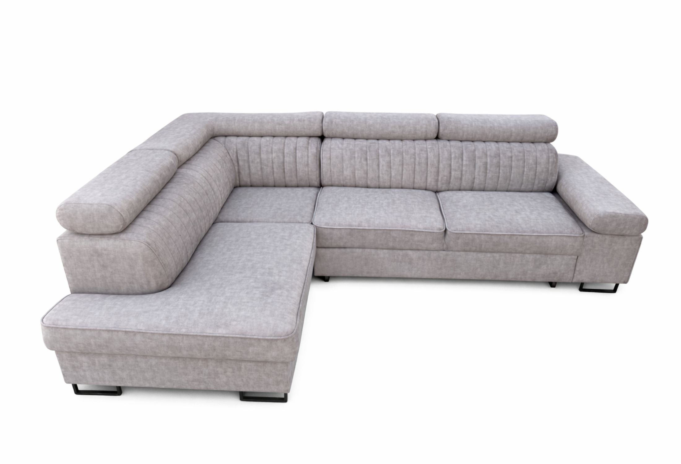 Narożnik został wyposażony w ruchome, regulowane zagłówki oraz podłokietnik, które pozwalają dopasować wysokość oparcia do własnych preferencji. Możesz ustawić je w pozycji niższej – dla nowoczesnej, lekkiej formy – lub podnieść podczas odpoczynku, aby uzyskać wygodne podparcie dla głowy i karku.