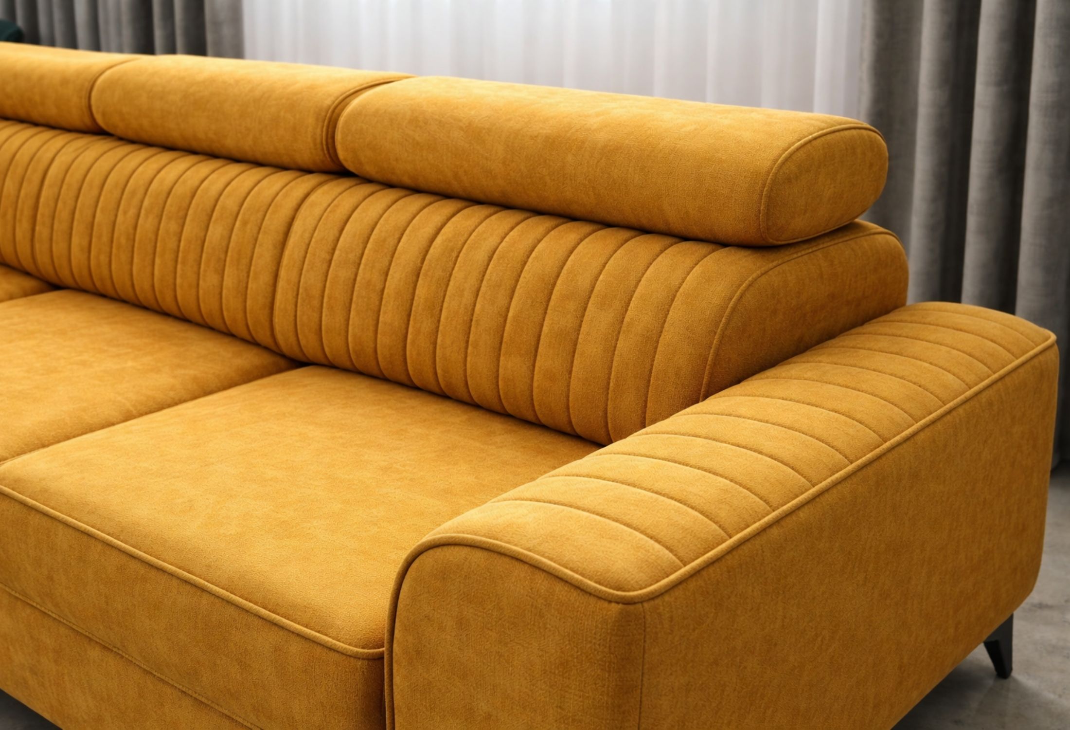 Wysokość sofy regulowana w zakresie 81–98 cm pozwala dostosować ułożenie oparcia do indywidualnych preferencji. Podniesione zagłówki zapewniają lepsze podparcie dla karku i głowy, natomiast w pozycji opuszczonej sofa zyskuje niższą, nowoczesną linię.