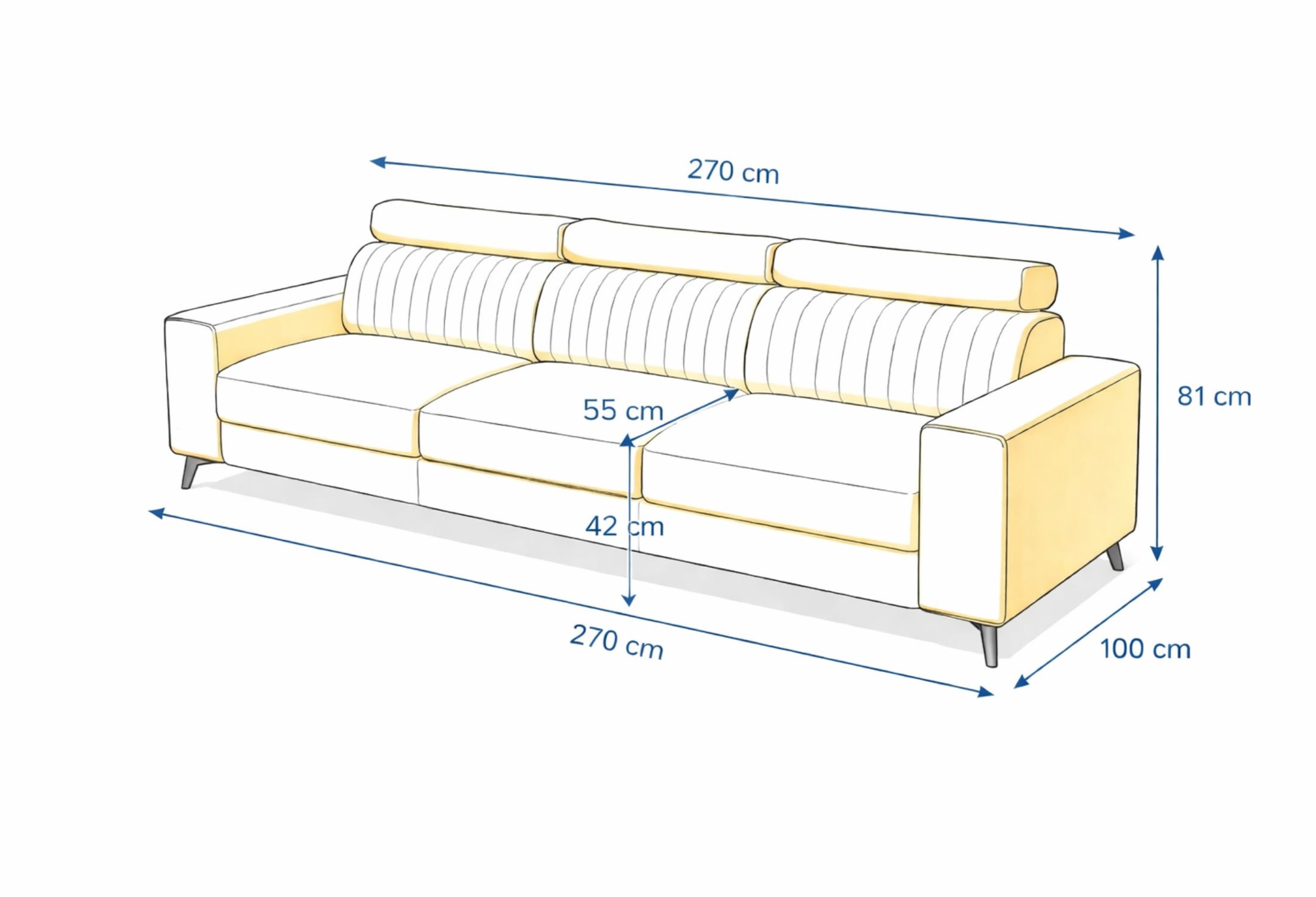 Nowoczesna sofa o szerokości 270 cm to idealne rozwiązanie do przestronnego salonu, strefy wypoczynkowej lub apartamentu. Prosta, elegancka forma, pionowe przeszycia na oparciu oraz smukłe nóżki nadają jej ponadczasowy charakter, który sprawdzi się zarówno w aranżacjach nowoczesnych, jak i minimalistycznych czy loftowych.