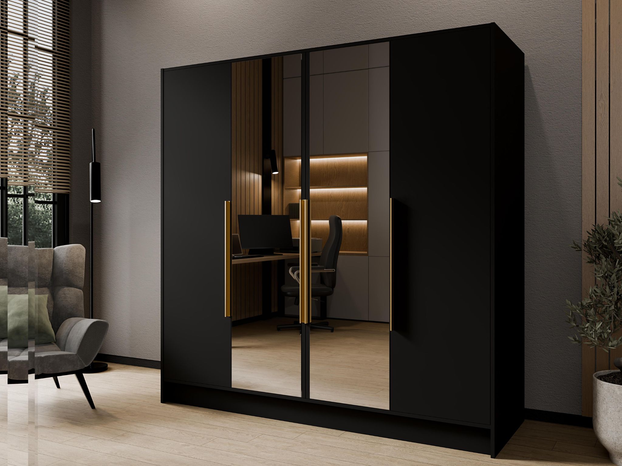 Dzięki prostym, czarnym lub złotym uchwytom i gładkim frontom mebel prezentuje się elegancko i lekko. Wykonana z wysokiej jakości płyty laminowanej, szafa jest odporna na zarysowania i łatwa w utrzymaniu czystości.