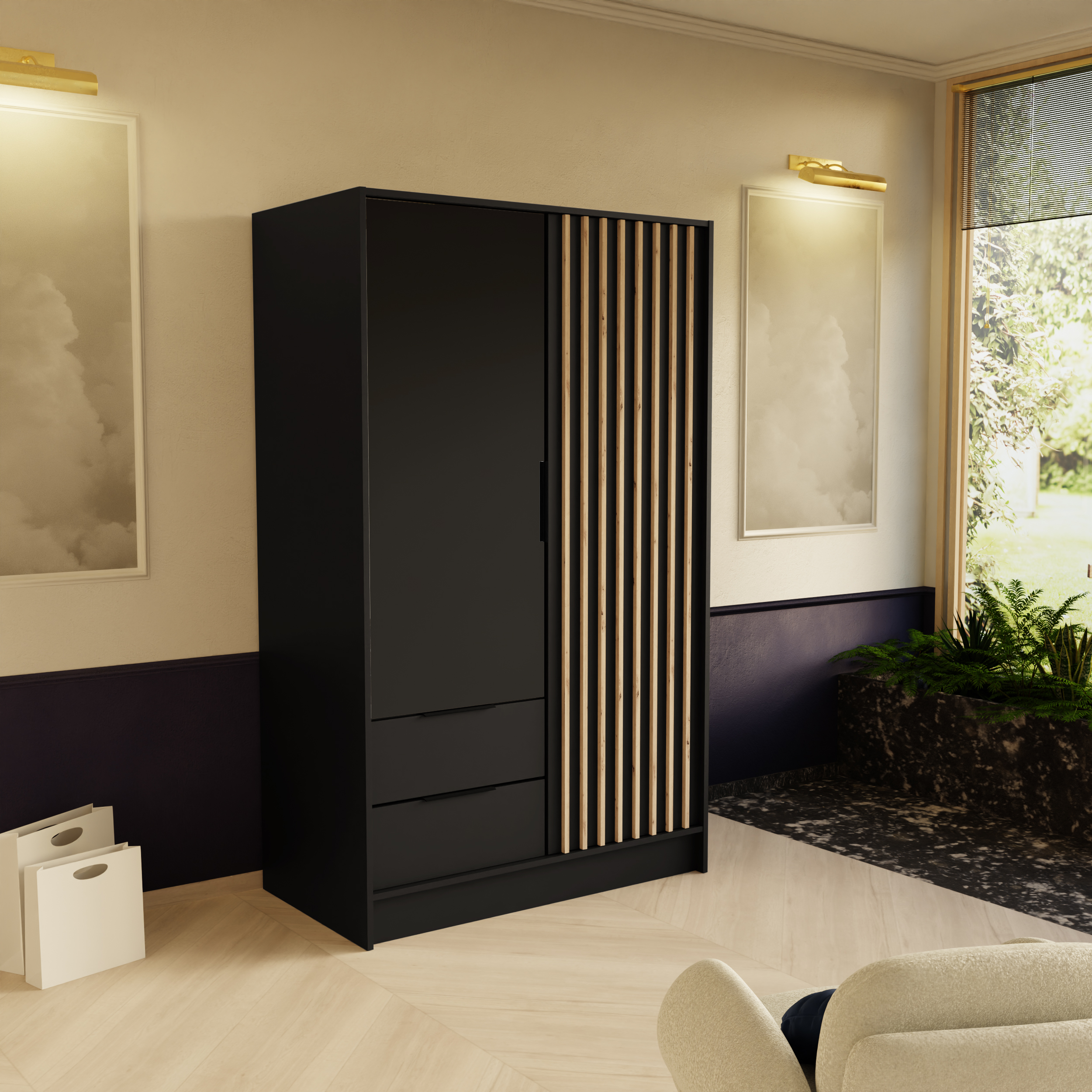 Szafa Nilo to połączenie nowoczesnego designu, funkcjonalności i najwyższej jakości wykonania. Korpus oraz fronty wykonane są z odpornej płyty laminowanej o grubości 16 mm, wykończonej trwałym obrzeżem ABS. Przód szafy zdobi osiem dekoracyjnych lameli (18 × 16 mm) w modnej kolorystyce wotan, które w modelu 102 umieszczono na jednym froncie, zaś drugi front jest gładki. Czarny, minimalistyczny uchwyt z tworzywa sztucznego podkreśla nowoczesny charakter mebla.