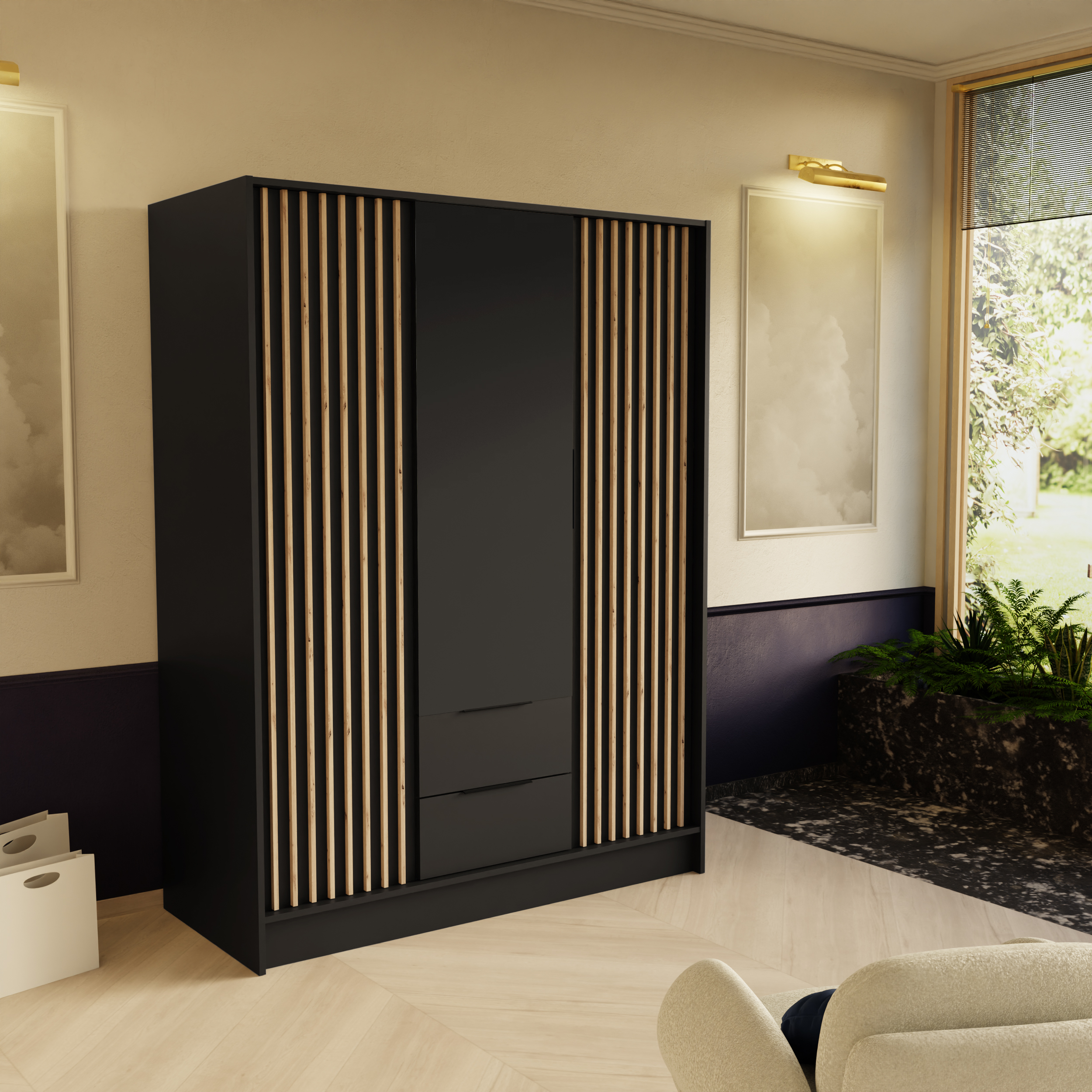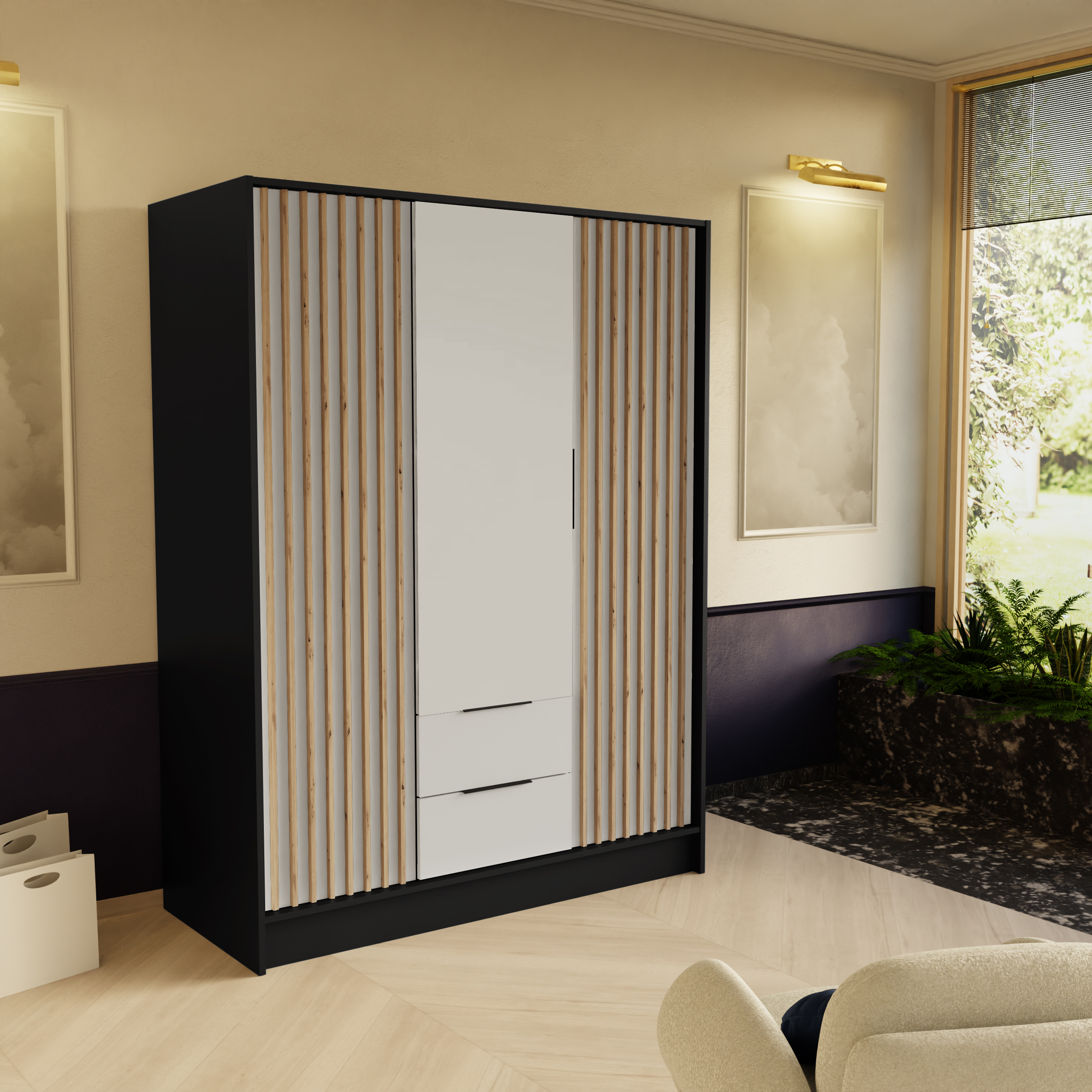 Szafa Nilo 150 cm to większa wersja, która łączy elegancję, trwałość i funkcjonalność. Korpus oraz fronty wykonane z odpornej płyty laminowanej o grubości 16 mm, wykończone trwałym obrzeżem ABS. Przód szafy zdobią dwie dekoracyjne panele lamelowe (8 lameli każdy panel, wymiary lamelek 18 × 16 mm) w kolorystyce wotan. Czarny, minimalistyczny uchwyt z tworzywa sztucznego podkreśla nowoczesny charakter mebla.