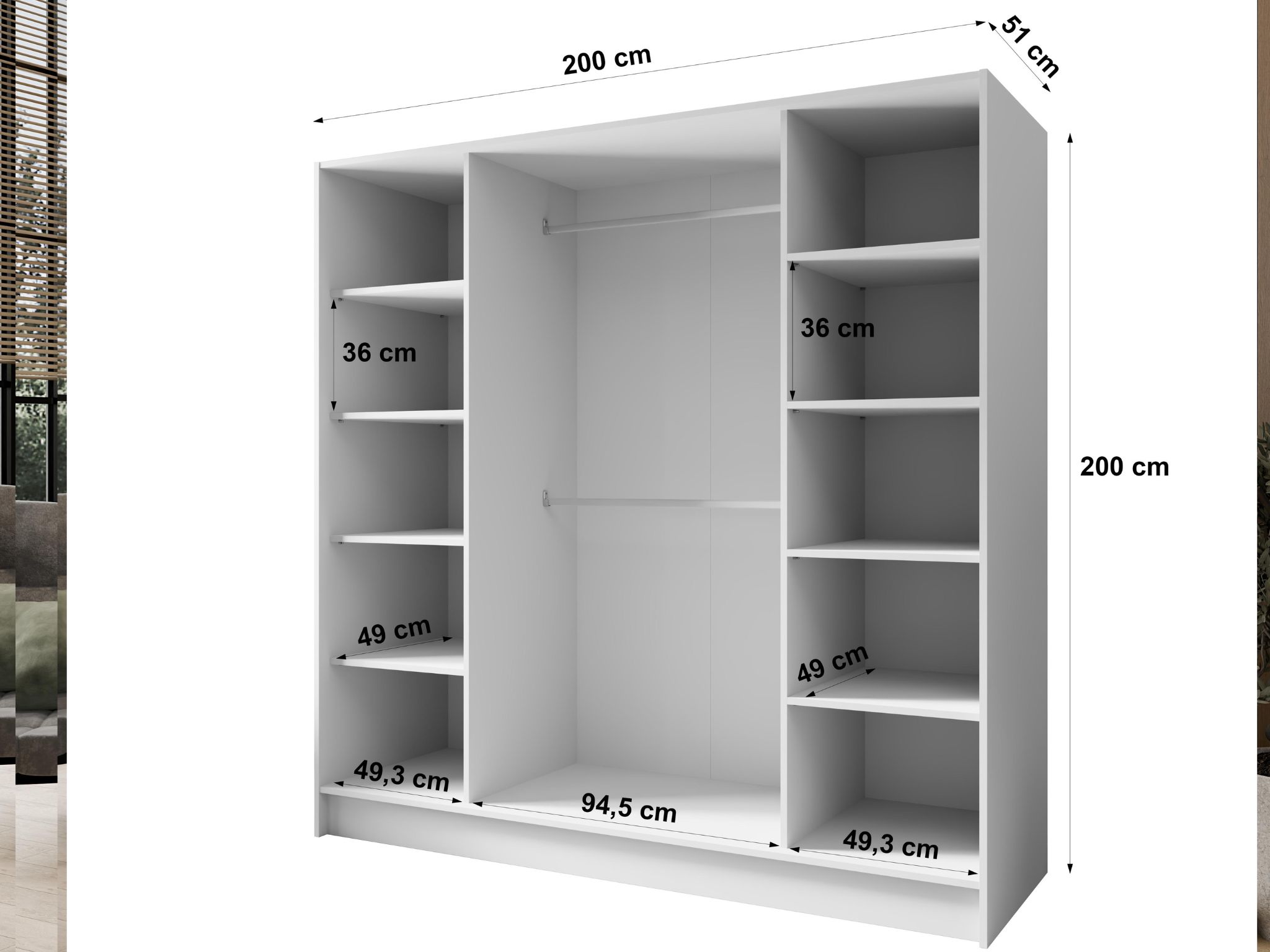 Nowoczesna i funkcjonalna szafa o wymiarach 200 × 200 × 51 cm to idealne rozwiązanie do sypialni, garderoby lub przedpokoju. Jej minimalistyczny design doskonale komponuje się z wnętrzami w stylu nowoczesnym, skandynawskim lub klasycznym.